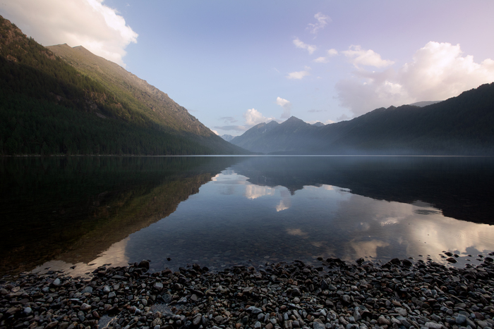 Нижнее Мультинское озеро на закате. Горный Алтай