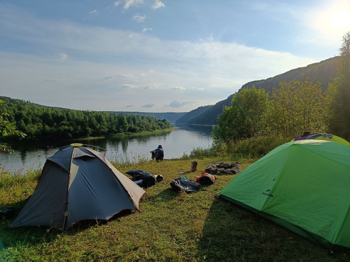 Собственно, около шести часов вечера было выбрано место под лагерь (с панорамным видом на Ветлан, хотя дальше были места и с крытыми столами, но все они были заняты, тут людей уже заметно больше) на правом берегу почти на повороте реки.