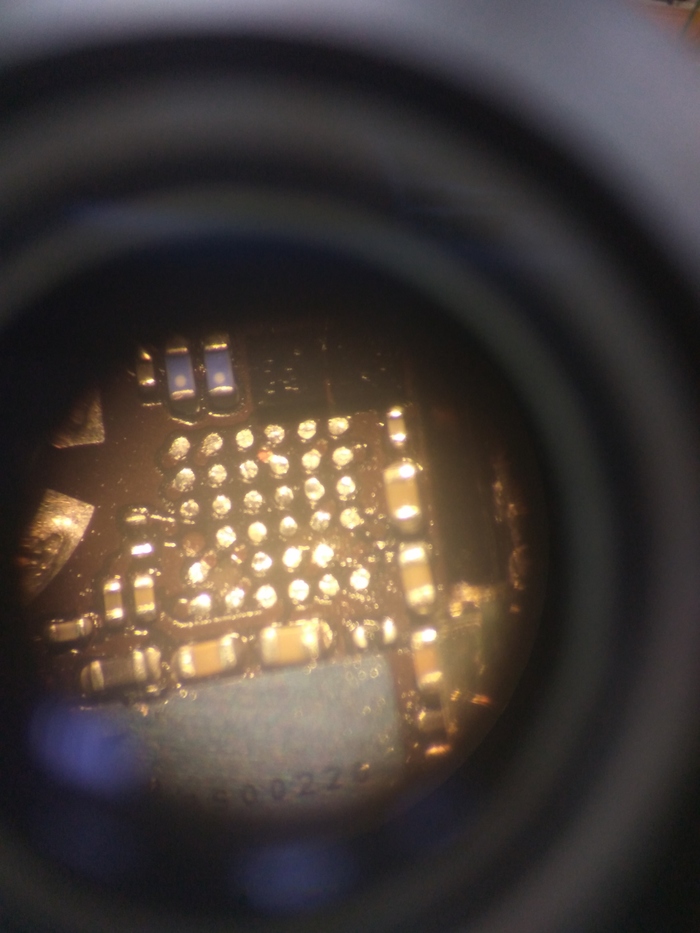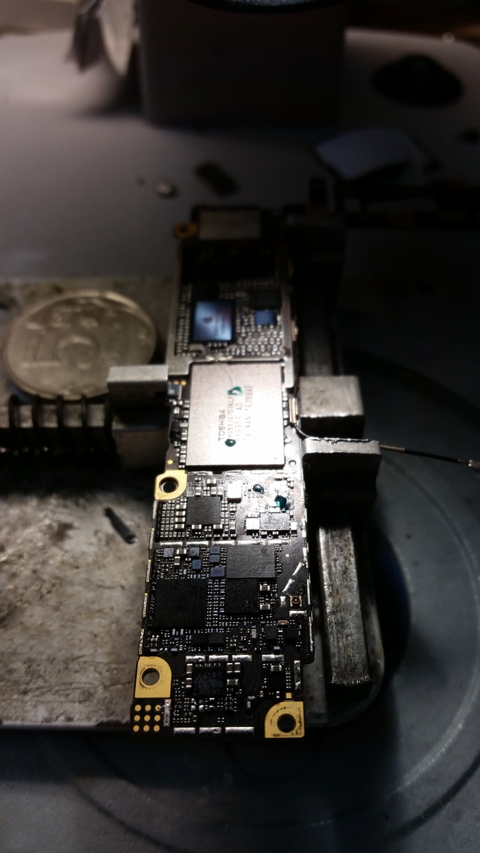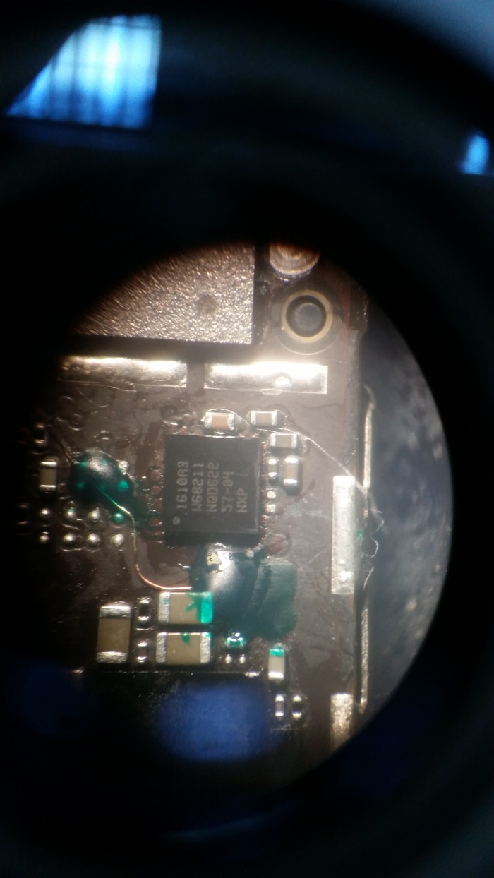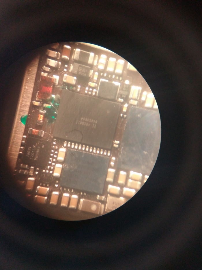 Дальше все стандартно: подкидываем на блок, аппарат включается с блока, потребление шкалит, в спячку не уходит, умер контроллер U2 Tristar. Раскручиваем, вынимаем плату, снимаем защитный экран, снимаем U2 и видим магию.