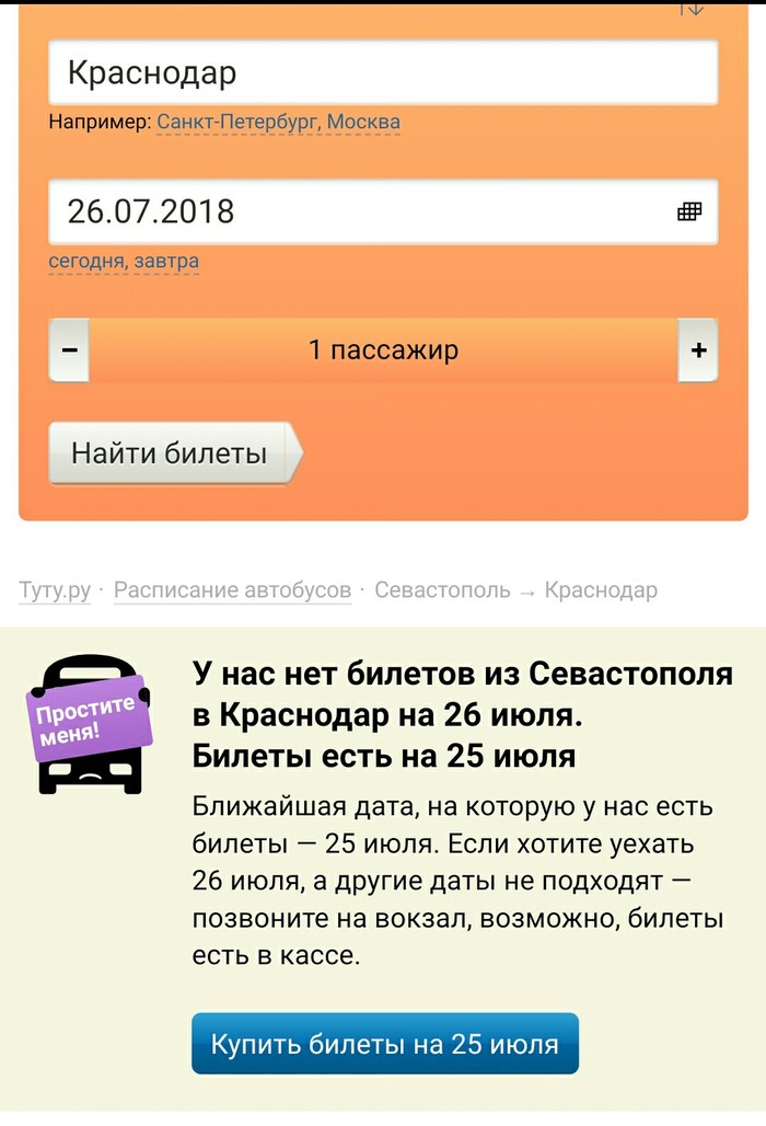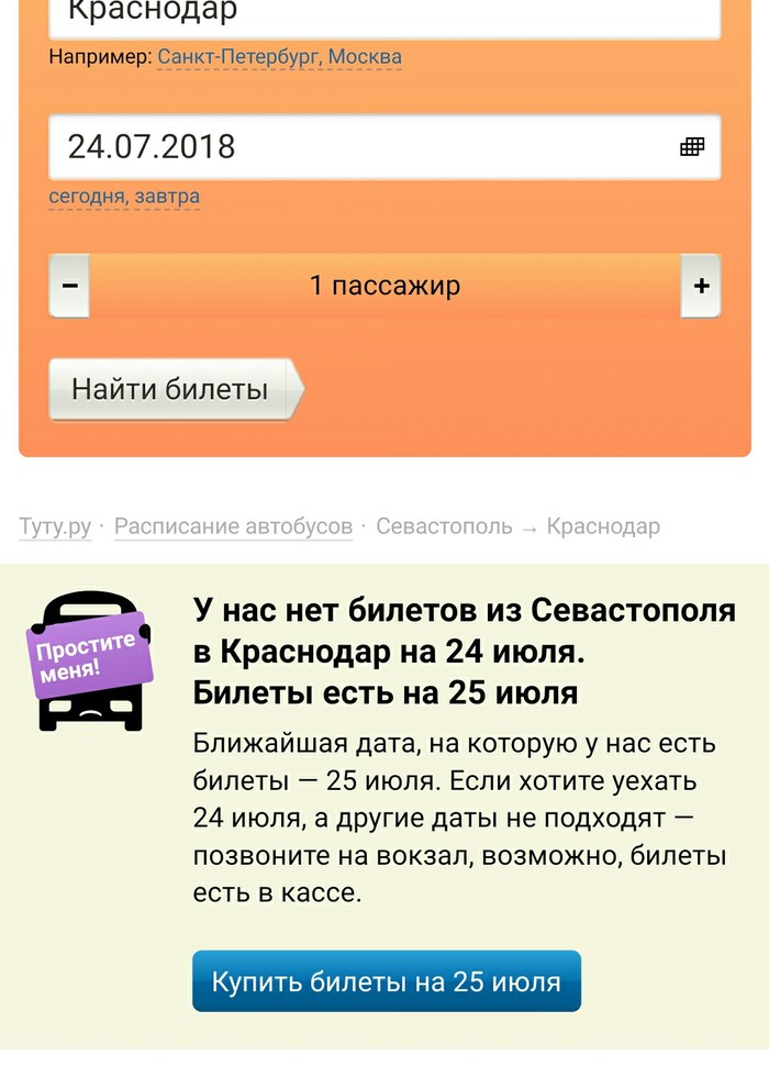 10 TGWizard 7 лет назад Интересный сайт :) Есть сайт по заказу билетов он-лайн, говорит что он на 1-м месте по России, но вот какой-то он странный :)Нужен билет на 26, но сайт против :) Ну ок, давайте на 25-е. Блин, не удобно, ну хорошо, давай хоть на 24-е. Да как так-то? Хороший сайт, ничего не скажешь. :) Показать полностью 3 [моё] Автобус Tuturu~ Поездка Длиннопост
