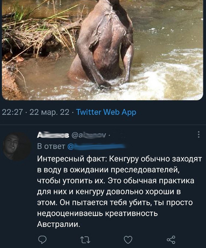Кенгуру, спасаясь от преследователей, залезает в воду и ждёт когда они войдут в воду, чтобы утопить. Кенгуру чертовски хороши в этом умении.