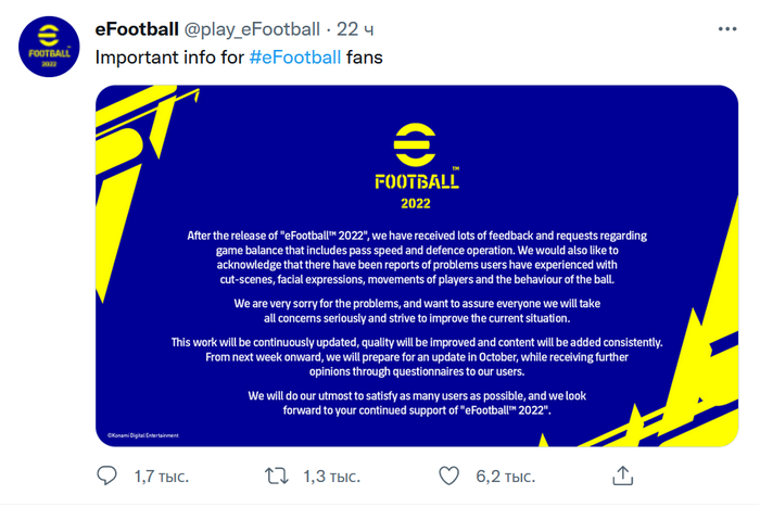Konami признала эту негативную реакцию и извинилась за катастрофический релиз игры. В заявлении, опубликованном на официальной странице игры в Twitter, компания признала проблемы с балансом игры, ее кат-сценами, движением игроков, выражениями лиц и т. д. и после сообщила, что исправления находятся в разработке, с непрерывными обновлениями, запланированными со следующей недели.