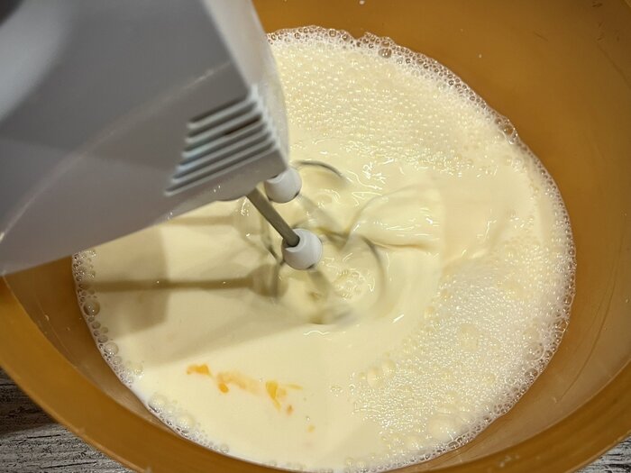 Яйца смешиваем с молоком до однородности. Далее начинаем добавлять муку по частям, тщательно размешивая. Я всегда использую миксер, но с венчиком тоже все получится.