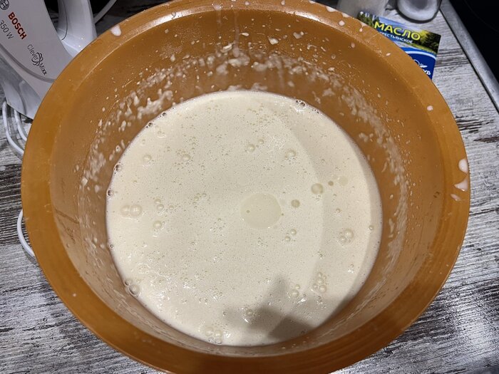 Теперь добавляем соль, сахар, соду, тщательно размешиваем. Вливаем подсолнечное масло, мешаем до однородности.