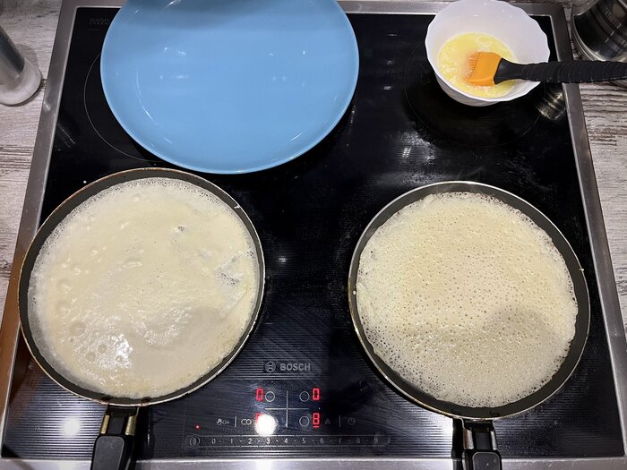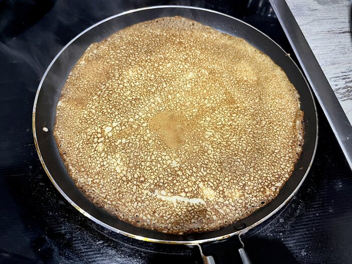По времени выпекания смотрите сами – тут единого правила нет, так как все сковороды разные. Перед переворачиванием блин должен быть золотистый с одной стороны, а с другой перестать быть жидким.