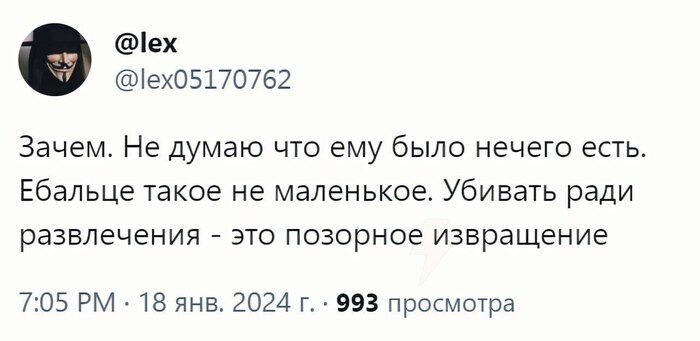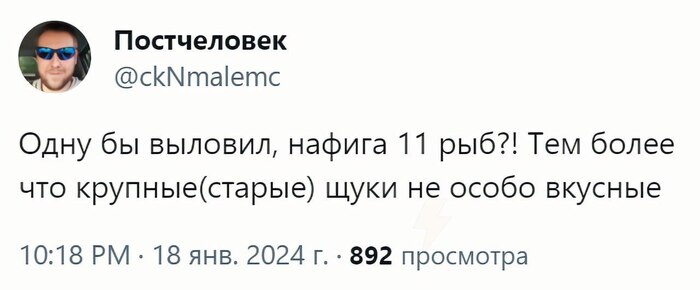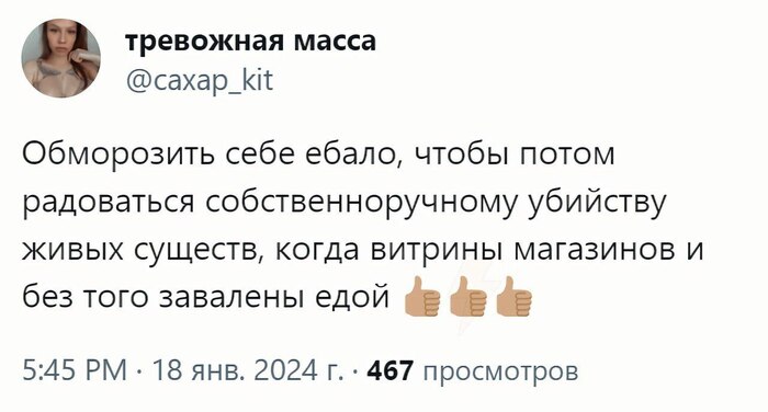 Не, если вы вегетарианец, то к вам тут вопросов нет - вы против убийства животных и ваша позиция последовательна. А вот что в головке у тех, кто докапывается до обычных рыбаков и охотников, попутно задорно похрумкивая стейком или бутербродиком с колбаской, мне сложно понять.