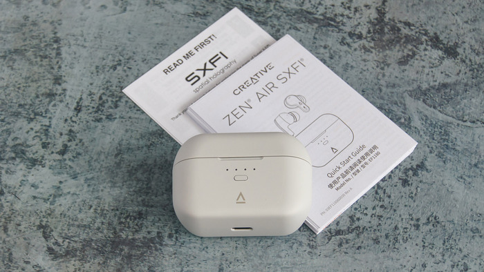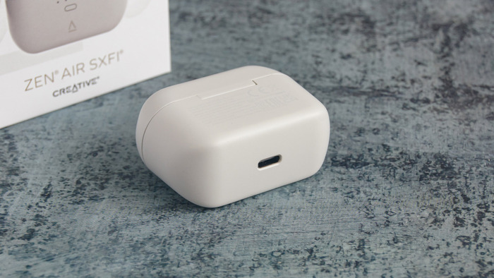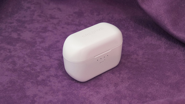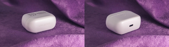 На верхней грани крышки разместилась надпись Creative, выполненная фирменным шрифтом, на нижней – разъем USB-C для зарядки. Кстати, поддерживается также беспроводная зарядка по стандарта Qi, но вот саму зарядку придется приобретать отдельно.