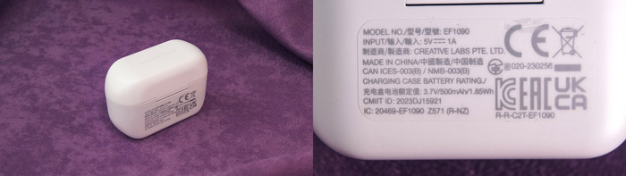 На обратной стороне кейса краской нанесена информация об устройстве, большая часть из которой малоинтересна. Из полезного: указана емкость аккумулятора кейса (470 мАч) и наушников (52 мАч).