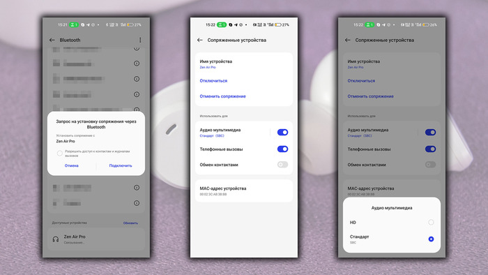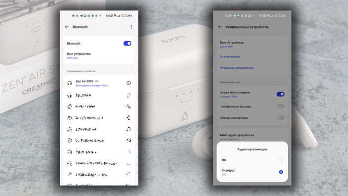 Наушники Zen Air Pro поддерживают кодеки AAC, LC3, LC3+(ULL) и SBC. Прослушивание производилось при помощи последнего.