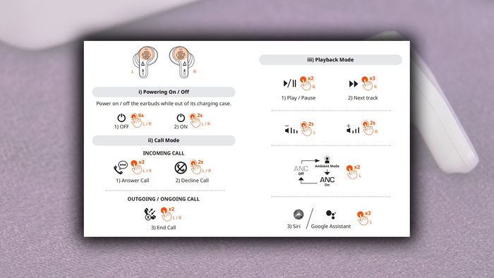 Уровень пассивного шумоподавления низкий. Надетые наушники почти не приглушают окружающие звуки. У обозреваемых наушников есть функция активного шумоподавления (ANC) с прозрачным режимом Ambient при включении которого слышно всё что происходит вокруг. Микрофоны улавливают фоновые звуки и пускают их в наушники. Полезно, когда нужно не только слушать музыку, но и мониторить окружающую обстановку. Например, во время пробежки или поездки на велосипеде. Режимы работы переключаются вкруг ANC on -> ANS off -> Ambient -> ANC on и далее по кругу. Жест переключения режима шумоподавления – двойной тап по левому наушнику. Кстати, площадь сенсорных поверхностей приличная и холостые тапы бывают крайне редко.