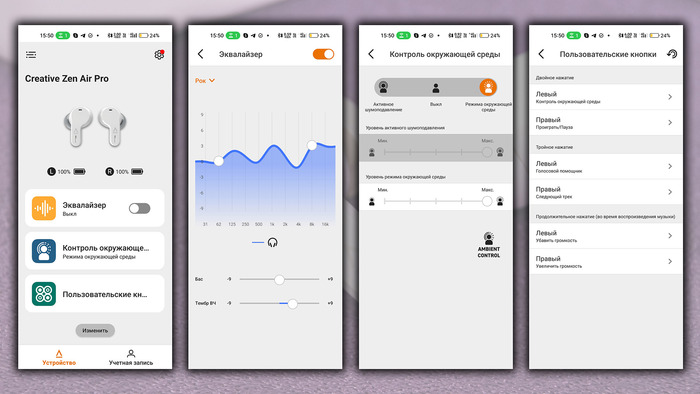 Функционалом наушников можно управлять через фирменное приложение Creative App. Там можно посмотреть уровень заряда наушников, настроить эквалайзер, отрегулировать уровень шумоподавления, а также изменить управление.