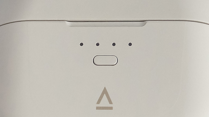 Для удобства открывания крышки у кейса предусмотрена небольшая прорезь. Под ней расположены четыре миниатюрных индикатора уровня заряда и кнопка управления. В самом низу можно заметить логотип бренда похожий на стилизованный треугольник. Выполнен он серой краской.