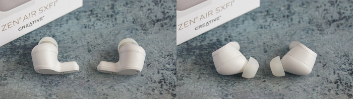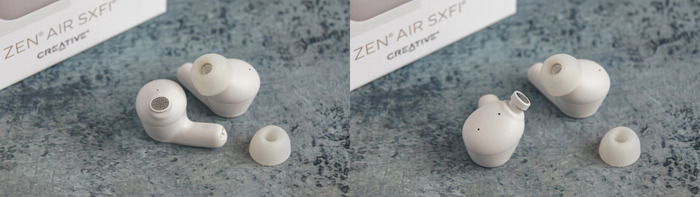 Дизайн наушников Creative Zen Air SXFI предполагает ножку. Внешняя часть корпуса плоская, будто отсеченная. Сенсор управления расположен на круглой верхней части. В верхней части можно заметить отверстие одного из микрофонов. Ниже, на ножке, находится светодиодный индикатор и уже знакомы логотип бренда.