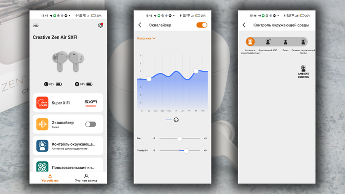 Приложение показывает уровень заряда каждого наушника по отдельности, позволяет настраивать сенсорное управление, использовать эквалайзер (выбирать из предложенных пресетов или создать собственный), а также управлять режимами ANC и его чувствительностью или отключать его.