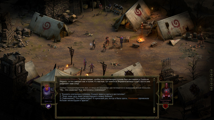 Выбор решений просто колоссален, я даже не знаю, какие еще игры настолько же нелинейны. Это ролевая игра в полном смысле. Первое мое прохождение я проделал государственником, Lawful Neutral, пусть свершится правосудие; если можно быть человечным - то ок, но если для благополучия державы надо предать огню город, то мы его сожжем к черту. Но можно быть кровавым отморозком, бюрократом-взяточником, _хорошим парнем_, реально, можно адекватно пройти игру в очень разном ключе. Я очень люблю "Пилларс оф Этернити", и по стилю геймплея больше всего "Тирания" похожа именно на нее, но здесь свобода выбора просто зашкаливает. При этом чисто игромеханически не удастся сделать хорошо всем хорошим и плохо всем плохим, нужно расставлять приоритеты. Посмотреть весь мир за одно прохождение не удастся, и я очень рекомендую пройти игру хотя бы дважды - благо, она короткая. Отправьте вершителя в разные точки в прологе, становитесь на сторону Опальных или Хора - "Тирания" будет поворачиваться разными углами и выдавать одну историю с разных концов. Кстати, там есть возможность сыграть и за повстанцев - это не вполне тривиально, и лучше заранее читните гайды, если хотите так сделать, но за "хороших" все-таки лучше поиграть после того, как один раз в другой жизни вы их всех запытали и перевешали - ощущения намного острее.