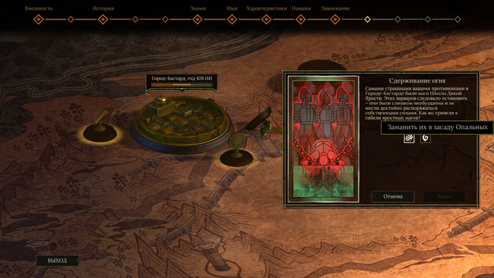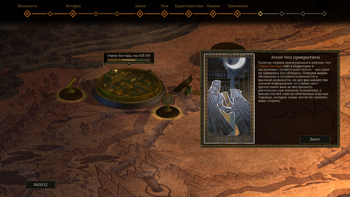 Как легко догадаться, лор игры очень плотный; политика, история мира, личные истории персонажей - все переплетается што в твоем "Ведьмаке". Вот в этом океане мы и будем плескаться. Общая атмосфера довольно нетипичная для фэнтези, хотя и темного - это не Средние века, а что-то, похожее на эллинистические царства Азии сразу после завоевания Римом, или, скажем, ранние бронзовые цивилизации, типа Вавилона-Финикии-Хеттского царства. В ходу медь и бронза, архитектура, предметы и терминология явно "одревлены".