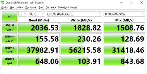 Синтетические тесты я начал с CrystalDiskMark. В агрессивных профилях с глубокой очередью накопитель выходит на те самые цифры, которые обычно ждут от USB 3.2 Gen2 x2. Последовательное чтение держится выше 2 ГБ/с, запись немного ниже, но все равно близко к заявленным значениям. Это короткие, плотные нагрузки, где диск работает на максимуме и не успевает перейти в более спокойный режим.
