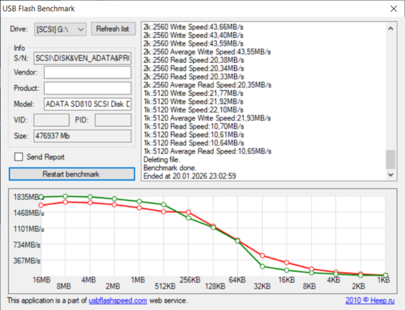 USB Flash Benchmark и ATTO Disk Benchmark хорошо показывают переход между режимами. На крупных блоках накопитель быстро выходит на рабочие скорости и дальше держит их стабильно. При уменьшении размера блока скорость падает плавно, без резких обрывов, но достаточно заметно. Особенно в зоне 32 КБ и ниже, где уже нет смысла ждать чудес от внешнего QLC-накопителя.