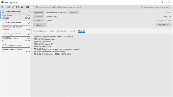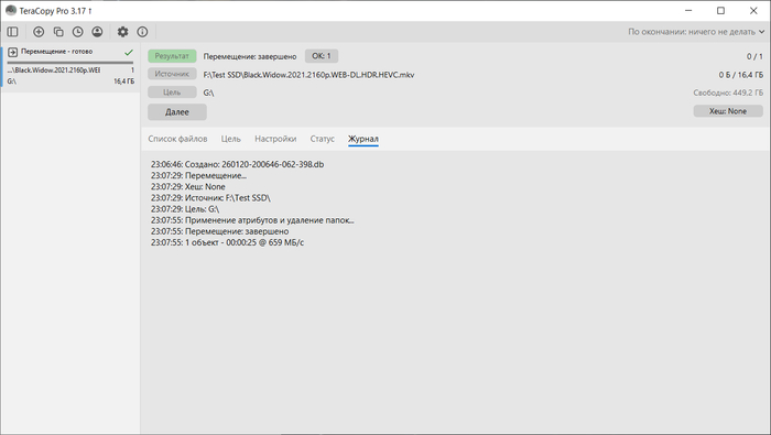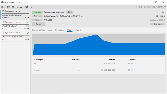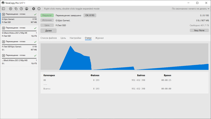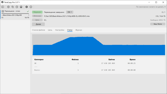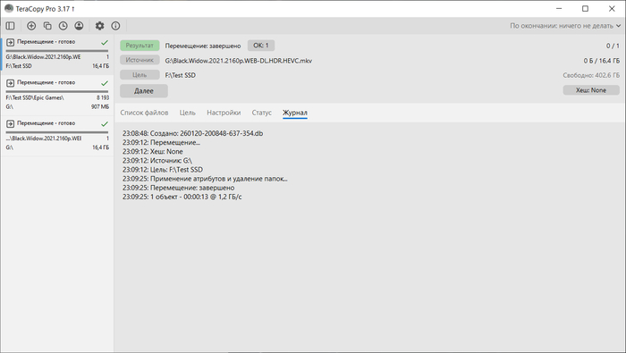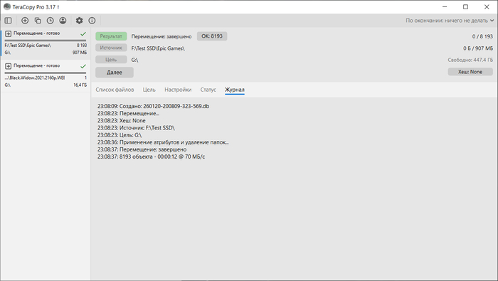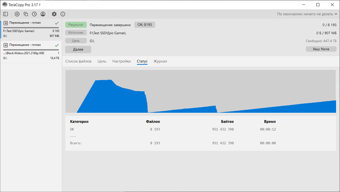 Реальные операции копирования подтверждают ту же модель. Один большой файл пишется быстро в начале, затем скорость снижается и стабилизируется. Папки с тысячами мелких файлов копируются заметно медленнее, потому что здесь решает не интерфейс, а характер нагрузки.