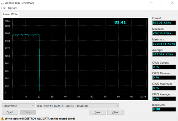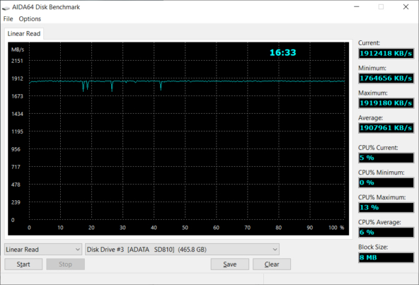 Самое интересное начинается в длительных тестах. В AIDA64 при последовательном чтении график почти ровный по всему объему. Скорость держится стабильно, без провалов и скачков. Это хороший показатель для сценариев, где важна именно скорость доступа к данным, а не запись.