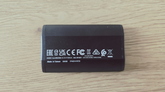 Формально здесь все выглядит ровно. Внешний SSD с интерфейсом USB 3.2 Gen2 x2, тем самым USB 20Gbps, разъем Type-C, заявленные скорости чтения и записи до 2000 МБ/с. Номинальная емкость 500 ГБ, в системе доступно 476 940 МБ. Питание стандартное для USB, 5 В, ток до 900 мА.