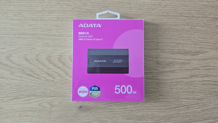 Упаковка у SD810 простая по конструкции. Обычная картонная коробка, но визуально она выделяется. Розовый фон сразу выбивается из привычного для внешних SSD ряда серых и черных коробок.