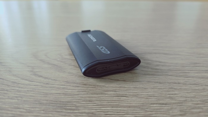 Внешне SD810 выглядит сдержанно и спокойно. Корпус вытянутый, с плавно закругленными торцами и ровной геометрией по всей длине. Основной цвет черный, поверхность матовая, без глянца и декоративных элементов. По центру верхней панели проходит более гладкая полоса с надписями ADATA и SSD, за счет чего корпус визуально не выглядит цельным бруском.