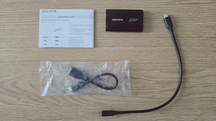 В комплекте сам накопитель и два кабеля. Один с разъемами USB Type-C и Type-A, второй – Type-C на Type-C. Это удобный набор, потому что не приходится угадывать, к какому устройству он будет подключаться.