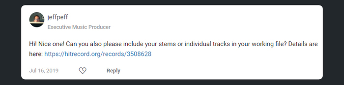 Музыкой я занимаюсь давно и материала который я мог предложить для участия в конкурсе накопилось большое количество. В итоге, это позволило мне увеличить шансы на победу. Шестнадцатого июля 2019 года я начал выгружать треки на Hitrecord. Скажу честно, конкуренция была очень высокой и желающих победить было не мало, так как конкурс был международным. Спустя пятнадцать минут после публикации, мне пришел запрос на мультитрек от одного из организаторов конкурса, саунд-продюсера Jeffpeff.