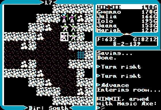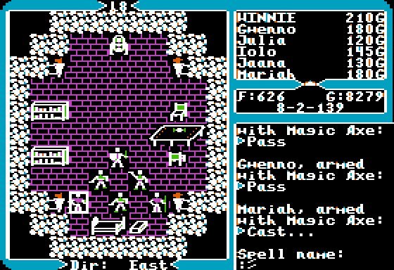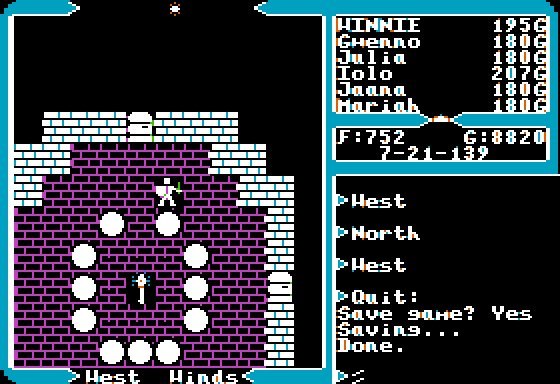 С посещением городов есть некоторая загвоздочка: в разное время в случайных трёх из восьми городов присутствуют Теневые Владыки. Аватар узнаёт о присутствии одного из них, ощущая злую ауру при приближении к городу. Противостоять им невозможно, и трюк с Амулетом уже не действует. Остаётся одно - бежать и скрываться. И вот, допустим, вы пограбили монстров, добыли денег на немного еды, и уже на исходе ресурса приходите в город, чтоб еды купить, а там - бац! - оказывается случайным образом Теневой Повелитель, и вам надо срочно сваливать отсюда. А куда сваливать? Вы идёте в другой город и по дороге умираете с голоду. Вообще к еде в Ультиме отношение нездоровое.