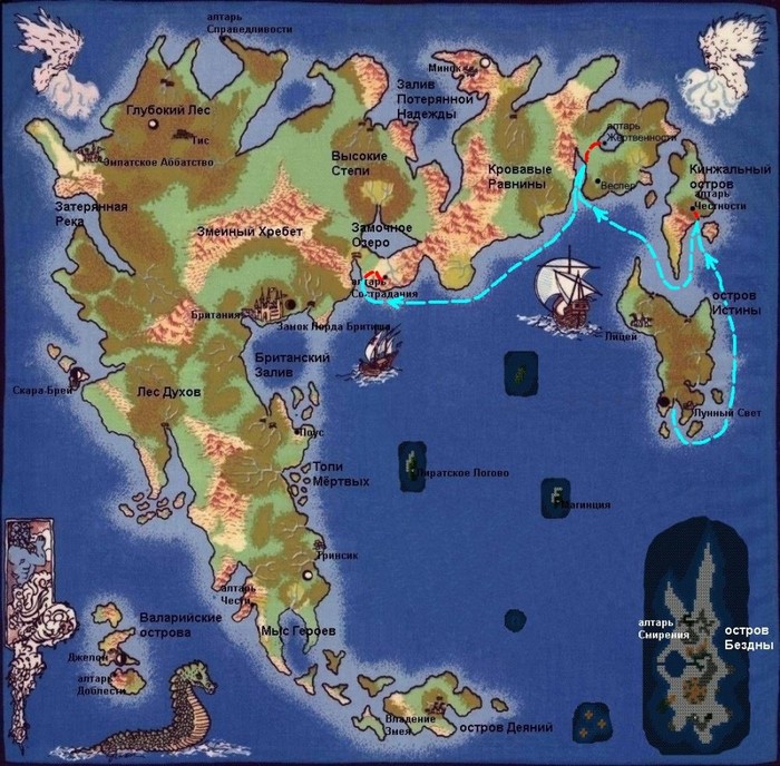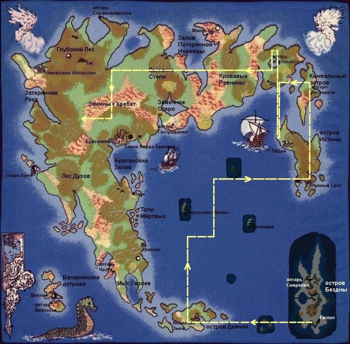 В общем, на небе есть восемь планет, каждой из которых соответствует своя добродетель. Так вот, если посмотреть в телескоп на ночное небо, там можно видеть также три кометы. По словам Захарии, эти кометы - традиционный злой знак - появились приблизительно в то же время, что и Теневые Владыки. Если сопоставить кометы с тремя Теневыми Владыками, которые бродят по миру, а планеты с городами Британии, то, наблюдая ночью, к каким планетам приближаются кометы, можно определить, визита в какие города следует избегать на следующий день. Кроме того, Захария оказывается членом Сопротивления и может рассказать о том, что в городе Джелом живёт маг по имени Гёт, владеющий знанием о недавно обнаруженной "силе лунных врат". Говорят, правда, что он безумен...