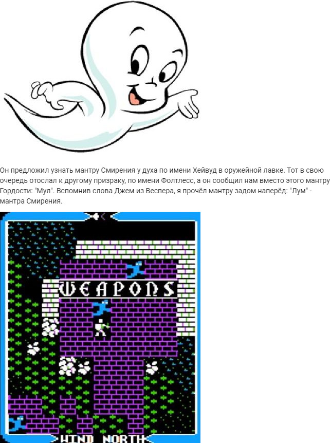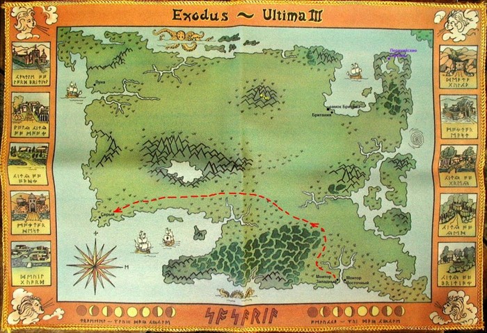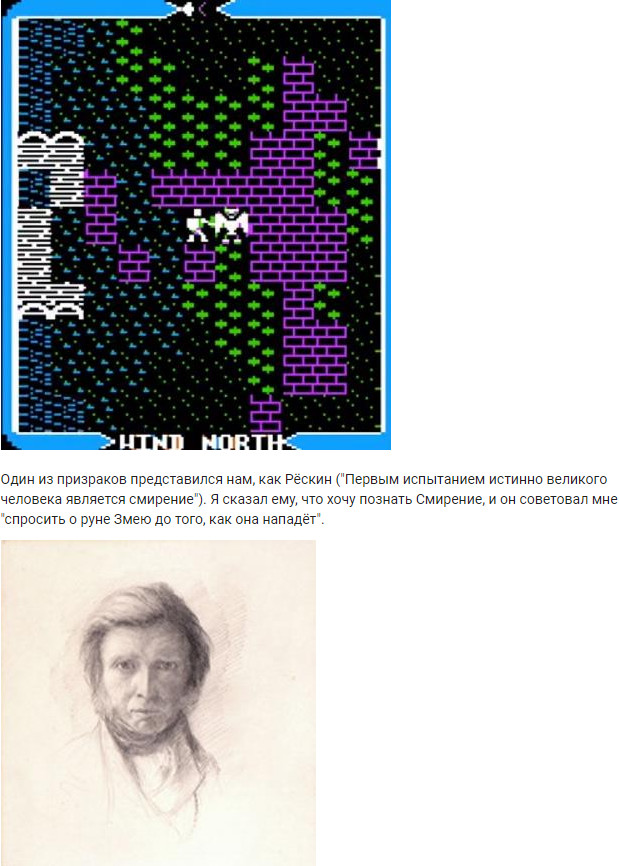 Это была крупная деревня, даже городок у подножия горы, обнесённый стеной. Там мы встретили сэра Саймона и леди Тессу. Они называли себя "хранителями" чего-то секретного (но мы-то знаем, чего). Когда я спросил их о мистических оружии и доспехах, то получил ответ, что их секрет будет раскрыт лишь тому, кто преуспел во всех восьми добродетелях и готов стать Аватаром. Ну и ладно. Главное, что мы теперь знаем, к кому обращаться.