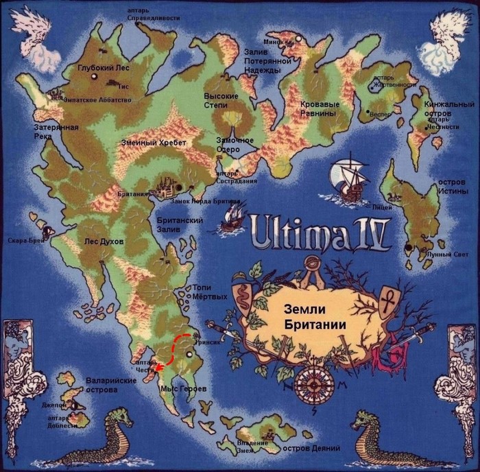 Восстановив силы, посетив провидца Хоуквинда и пополнив запасы, мы решили отправиться на Кинжальный остров в поисках алтаря Честности. Сразив попутных монстров, мы добрались до восточной оконечности Британии и использовали заклинание телепортации, чтобы пересечь пролив. Кинжальный остров густо порос лесом, и нам пришлось изрядно по нему поблуждать в поисках алтаря, который в конце концов был обнаружен в юго-восточной части острова.
