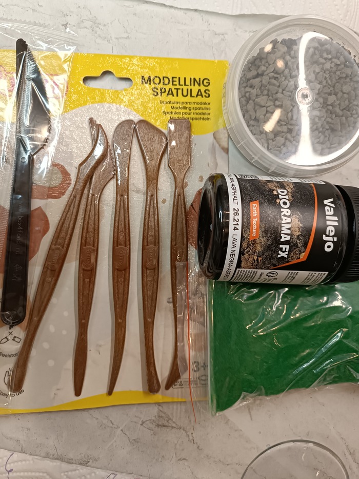 Для этого я купил текстурную пасту от vallejo, гранитную крошку и траву. Советовали грунт для рыбок, но мне показалось что серые камни впишутся лучше. Вместо шпателька взял какие-то инструменты для лепки, у них более прикольные поверхности). Специально не брал траву кустиками тк предполагаю что рассыпчатую траву можно как-то залакировать. Не хочу чтобы трава потом повыпадала