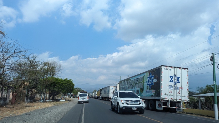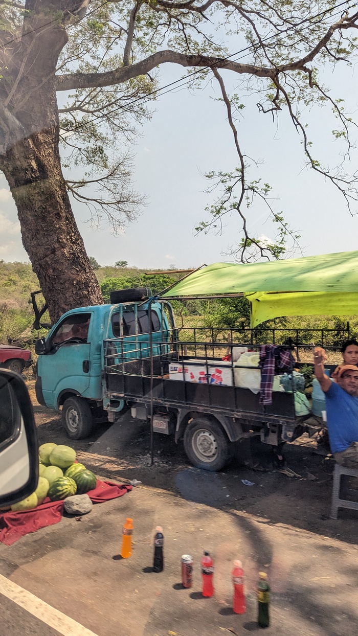 Очередь из большегрузов в обе стороны. Некоторые водилы вешают гамак прямо под кузовом и предаются Сиесте. Жарко. Наш Водитель ехал как попало, по обочине, встречке и тротуарам, яростно бибикая. На перекур шофер остановился прям посреди поля, и без стеснения облегчился, отвернувшись от дороги. Девчонки смущённо хихикали.