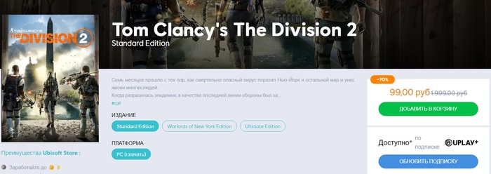 В данный момент в магазине Uplay можно купить The Division 2 за 99 руб.