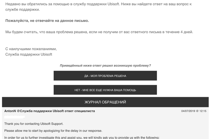 Вот такое круто письмо мне пришло после обращения в техпод Uplay:
