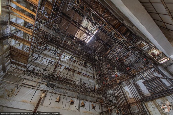 Начать осмотр заброшенного здания мы решили со сцены. Удивительно, но металлические фермы освещения остались нетронутыми тогда как круглая, поворотная сцена была полностью разобрана и демонтирована.
