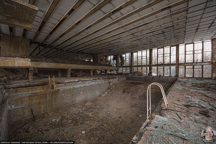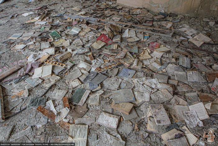 Кроме бассейна и сцены, здесь была городская библиотека, а также размещались детские кружки. Сейчас, лишь ворохи прелых, словно осенние листья книг и остатки интерьеров, позволяют что-то узнать в опустевших и безжизненных заброшенных комнатах.