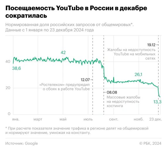 Падение аудитории у американского сервиса началось в сентябре 2024 года. Из-за внезапно отказавших серверов, которые Google, владелец YouTube, отказался обслуживать, качество сервиса значительно упало, что вылилось в сильное уменьшение скорости доступа. В конце 2024 года сервера начали отказывать окончательно (вот негодяи!), и работавший до этого без особых перебоев на мобильных сетях YouTube отказал и там. Интересно отметить, что никакого резкого роста числа пользователей VK после деградации серверов Google не наблюдалось. Российский сервис как рос, так и продолжает расти прежними темпами.