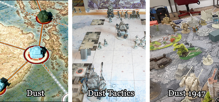 Начался данный варгейм, как настольная игра Dust, затем перерос в варгейм с игровым полем - Dust Tactics, а уже затем появился Dust 1947. Основное отличие Dust Tactics и Dust 1947 является способ измерения дистанции: в Dust Tactics используются клетки, а в Dust 1947 – линейка.