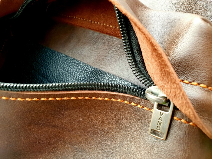 Формат этого рюкзака мне очень прижился, и я подумал, что почему бы не сделать точно такой же, но из кожи, который прослужит мне ещё дольше. В порядке самоиронии решил максимально сохранить все детали (нашивки, молнии и даже маленькую бирку на лямке).