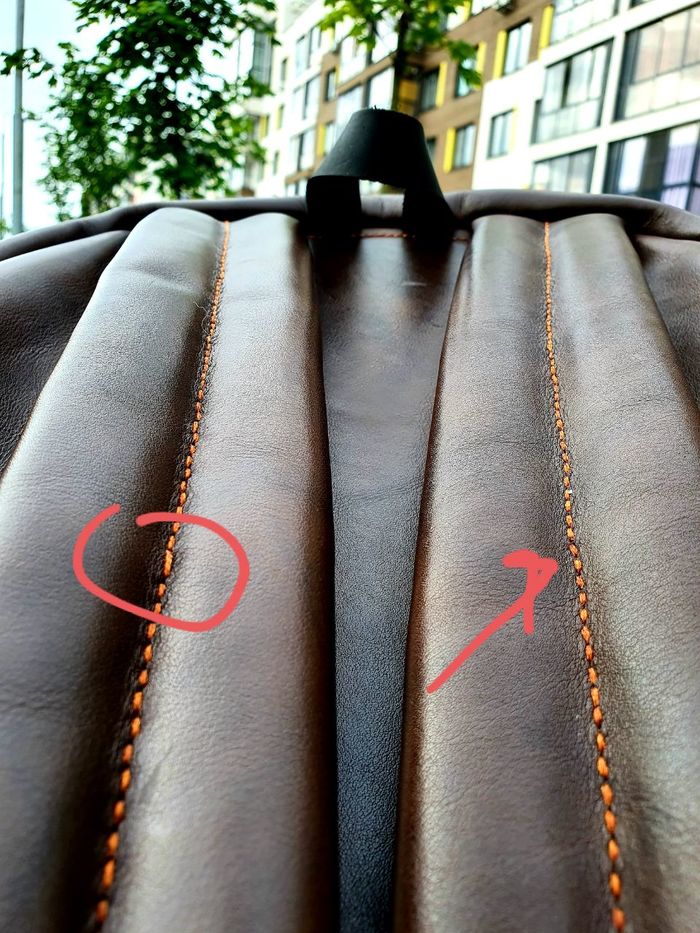 Это заставляет в некоторых местах шить через одно отверстие, немного подминая кожу под длинному шву. Как следствие это слегка может искажать изделие.