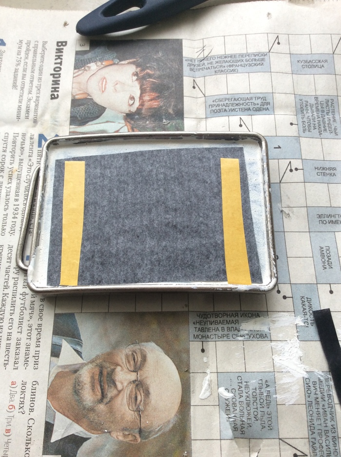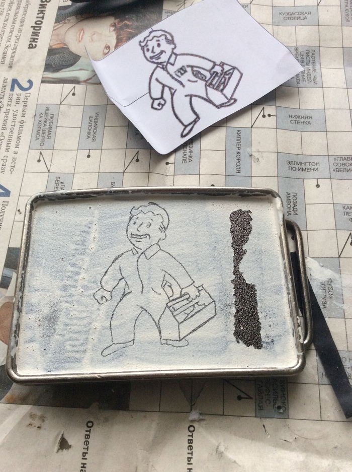 Нашел нужную мне картинку, распечатал, вырезал по размеру. Нашел дома белую гуашь, покрасил бляху. Двустронним скотчем на гуашь наклеил копировальную бумагу, на нее еще двустронний скотч: