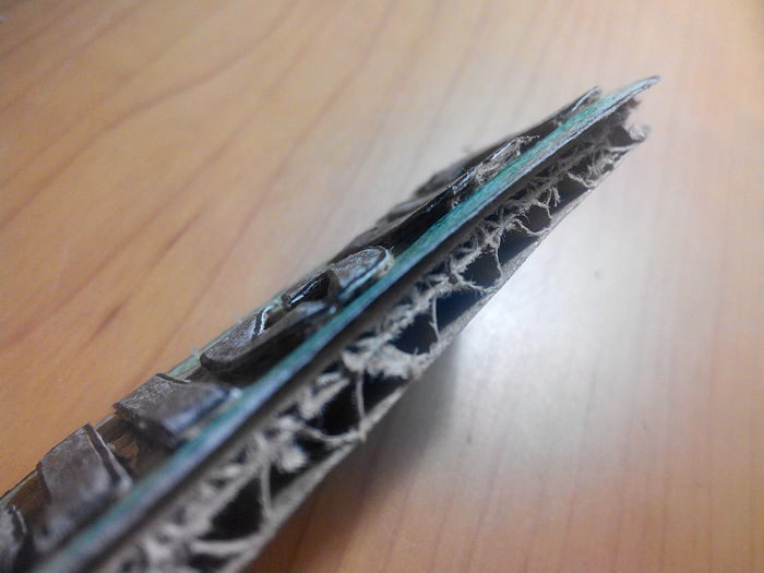 Ну потом на два-три часа вырезал по контуру и смыл гуашь. Затем дело за малым- сделать ремень. Пробойником делаю 2 дырки под винт, затем обрезаю винт до нужной длины. Чтоб было удобнееносить- той же шлифовалкой срезаю головку винта до высоты 1-2 мм и нарезаю плоский шлиц для отвертки, получается примерно так: