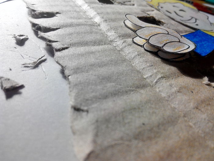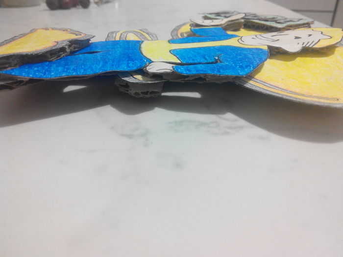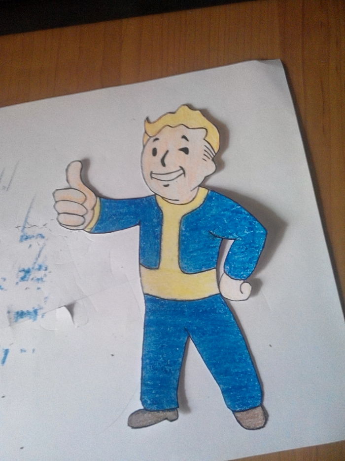 Вообще, в голове я все представлял немного лучше, но столкнулся с некоторыми проблемами. Во-первых, у моего блондинчика немного порвалась нога из-за контакта с клеем (на фото можно это заметить, но при обычном зрительном контакте ирл это мало, или же вовсе не заметно). Во-вторых, на ядерном грибе образовалось пару складок, опять же из-за клея. Думаю, пофикшу с помощью накладывания теней. Но в принципе, результатом я доволен. Вырезал кухонным ножом), разукрашивал все самыми бичовскими восковыми карандашами, которые успешно откопал в своей квартире. Картон-обычная разделанная мной картонная коробка.