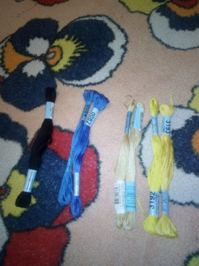 Для моего варианта нужно 10 цветов,но я решила,что не буду вышивать красный фон, а просто куплю красную ткань... Поэтому цветов у меня 9, а на фото 7 потому что ещё 2 у меня есть в виде огромного спутанного клубка -_-