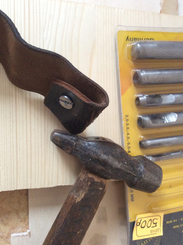 Инструменты и принадлежности- шлифмашинка, двусторонний скотч, копировальная бумага, пробойники по коже, ножовка по металлу, винт-гайка-шайба.