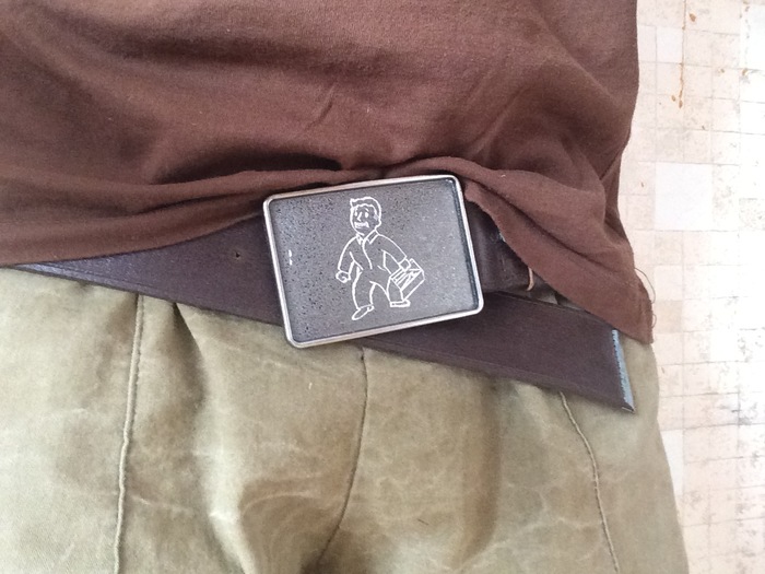 В рамках подготовки к полевой ролевке слелал себе ремень с ваулт-боем. Основа- армейский ремень ~150 рублей и пустая бляха с алиэкспресса: