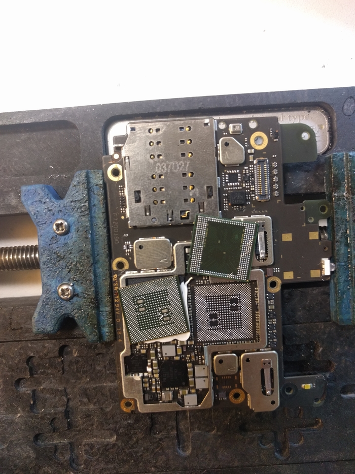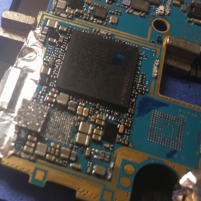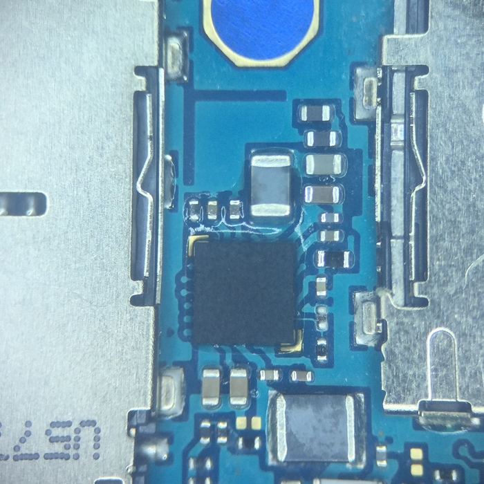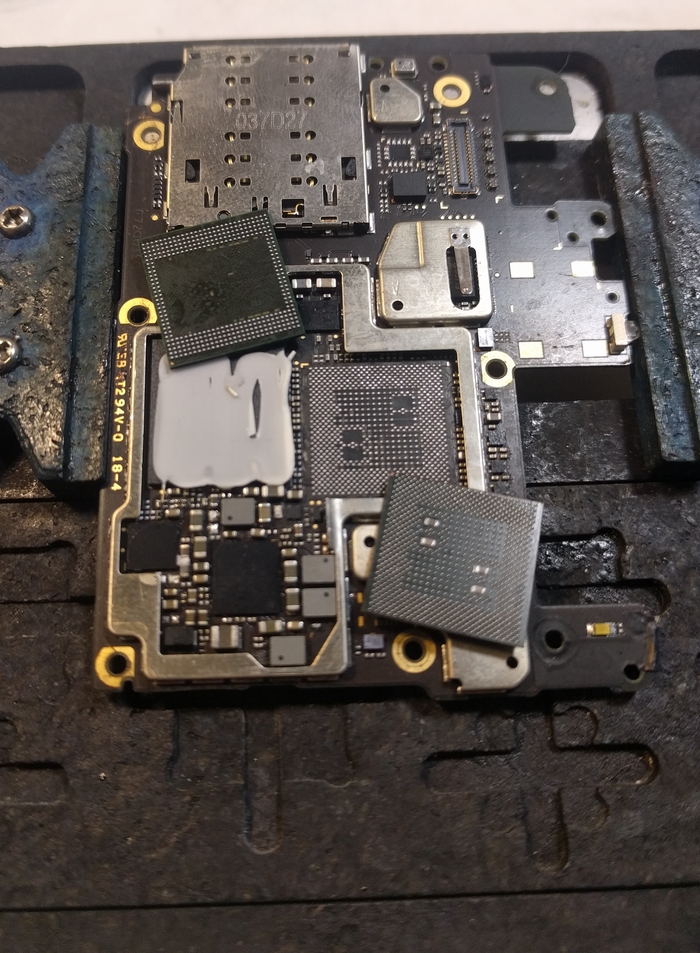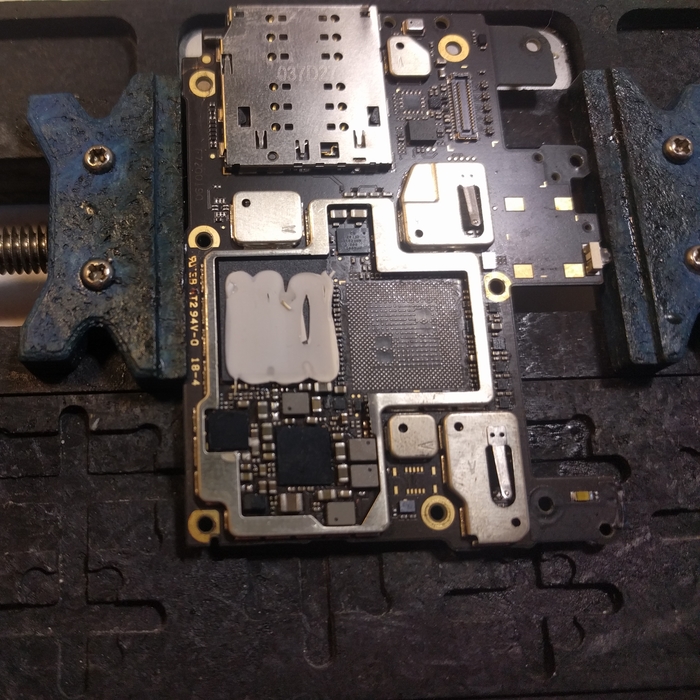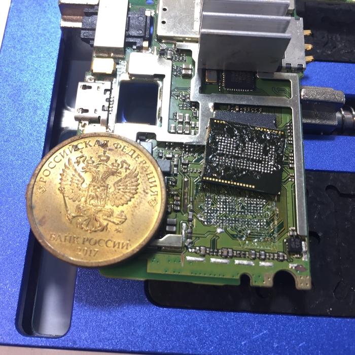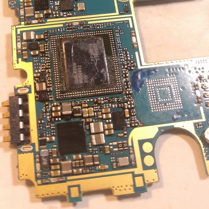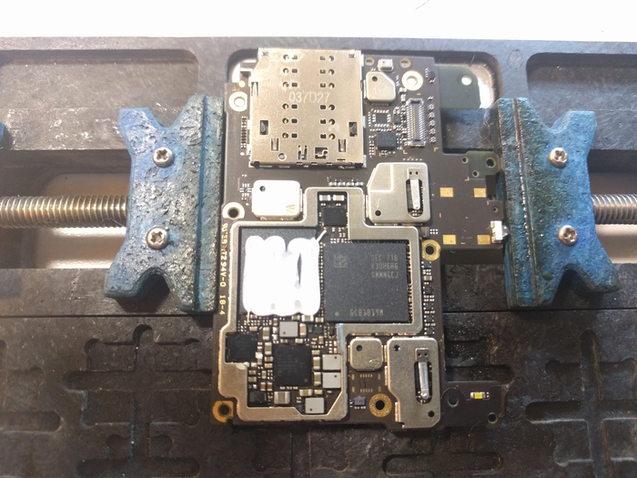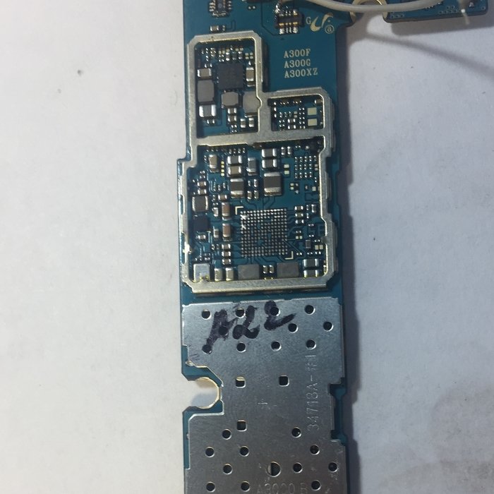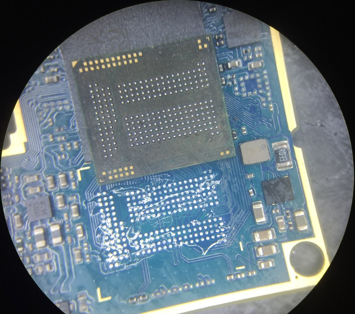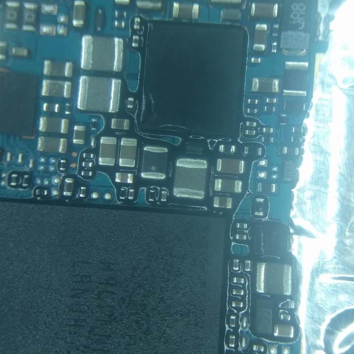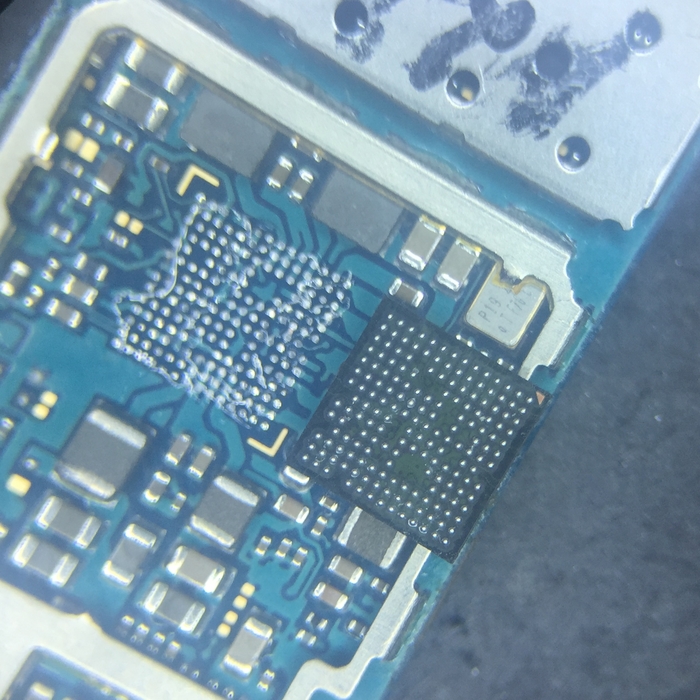 Без достаточной сноровки к ней будет проблемно подобраться поначалу, поэтому можно убрать лишние экраны для более простого доступа к микросхеме. Берем дремель и выпиливаем все ненужное, можно обойтись и кучасками, но в последующем дремель все равно будет необходим в ремонте.